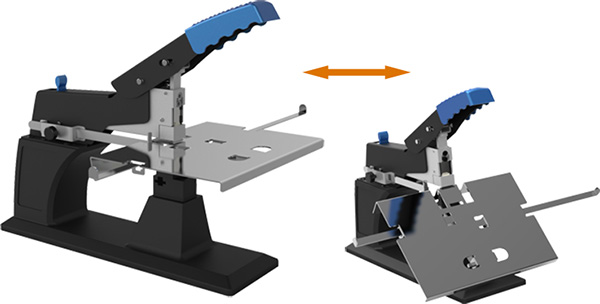 ◉第四步(骑马钉装订):将工作台切换成骑马式,调好边距调节杆,来确保每一本打钉的位置一致,将纸张放置在工作台上,压下手柄,装订完成